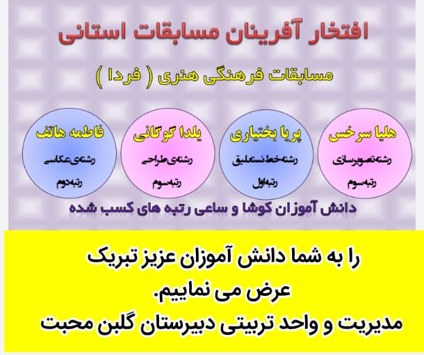 رتبه های استانی مسابقات مبارکشون باشه ……تلاشتان را می ستاییم و برگ زرینی بر افتخارات دبیرستان گلبن محبت میباشد . بچه ها خدا قوت . واحد تربیتی مدرسه .