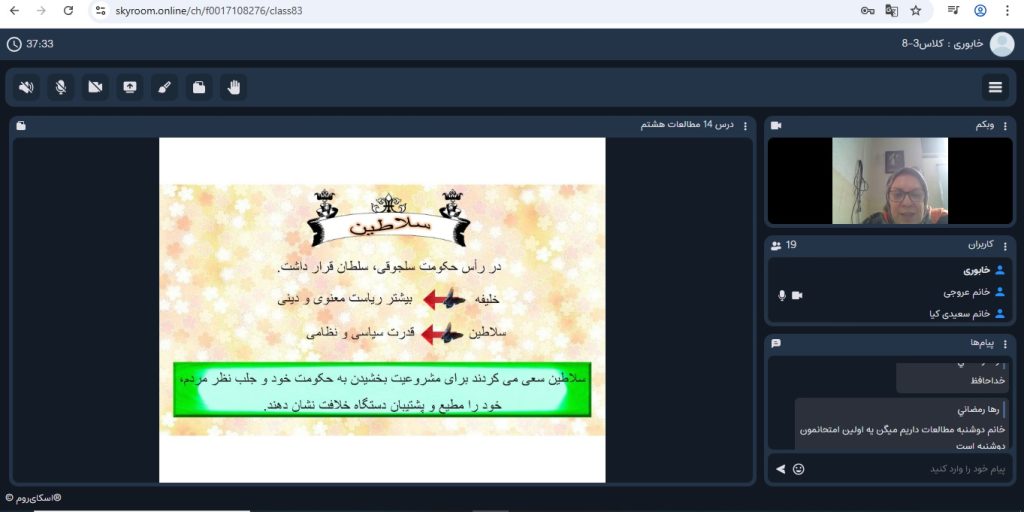 به اطلاع اولیا و دانشآموزان عزیز میرساند که کلاسهای آموزشی پایههای هفتم، هشتم و نهم، در بازه زمانی 20 تا 24 دی ماه با موفقیت و مطابق برنامه از پیش اعلامشده، بهصورت آنلاین و از طریق سامانه اسکایروم و نرمافزار شاد برگزار شد.